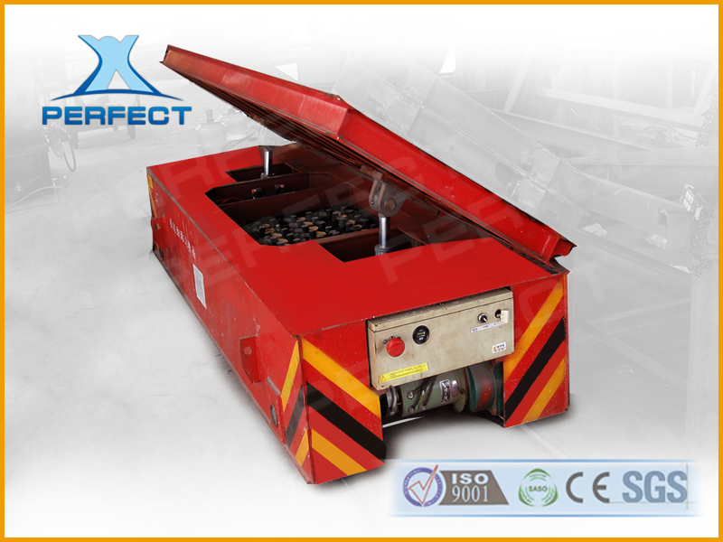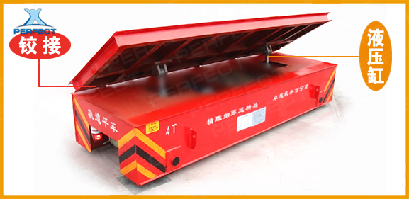側(cè)翻電動平車為液壓轉(zhuǎn)運車的一種,車體分為上下兩部分,之間由液壓缸相連,可通過液壓系統(tǒng)控制其升降來使其上層整體傾斜一定的角度,達(dá)到自動卸載貨物的作用。此類車在制藥、管材、糧食類等企業(yè)廣泛應(yīng)用。